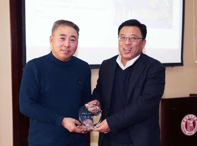 党委书记姚守齐(右)向退休教工刘建志颁发纪念品。