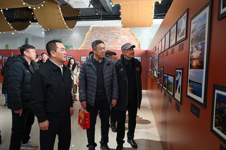 学校领导、退休校领导和参加团拜会的教职工共同参观“美丽山河・魅力沈体”教职工摄影展。