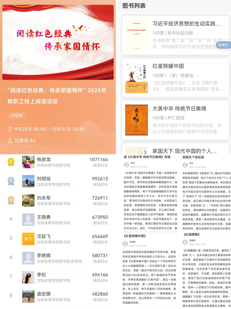 活动依托图书馆数字资源平台,精选《习近平经济思想的生动实践述评》《红旗飘飘》《家国天下:现代中国的个人、国家与世界认同》《决胜勇于争先看辽宁》等涵盖党的创新理论、革命历史、家国情怀、地方发展等内容,具有深刻思想内涵和教育意义的书籍,教职工通过线上平台每日打卡并分享阅读感悟,在知识的海洋中更加笃定前行,从智慧箴言里汲取力量。